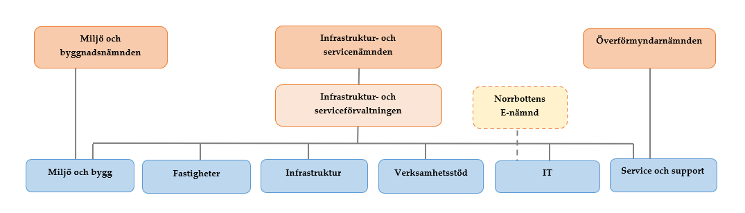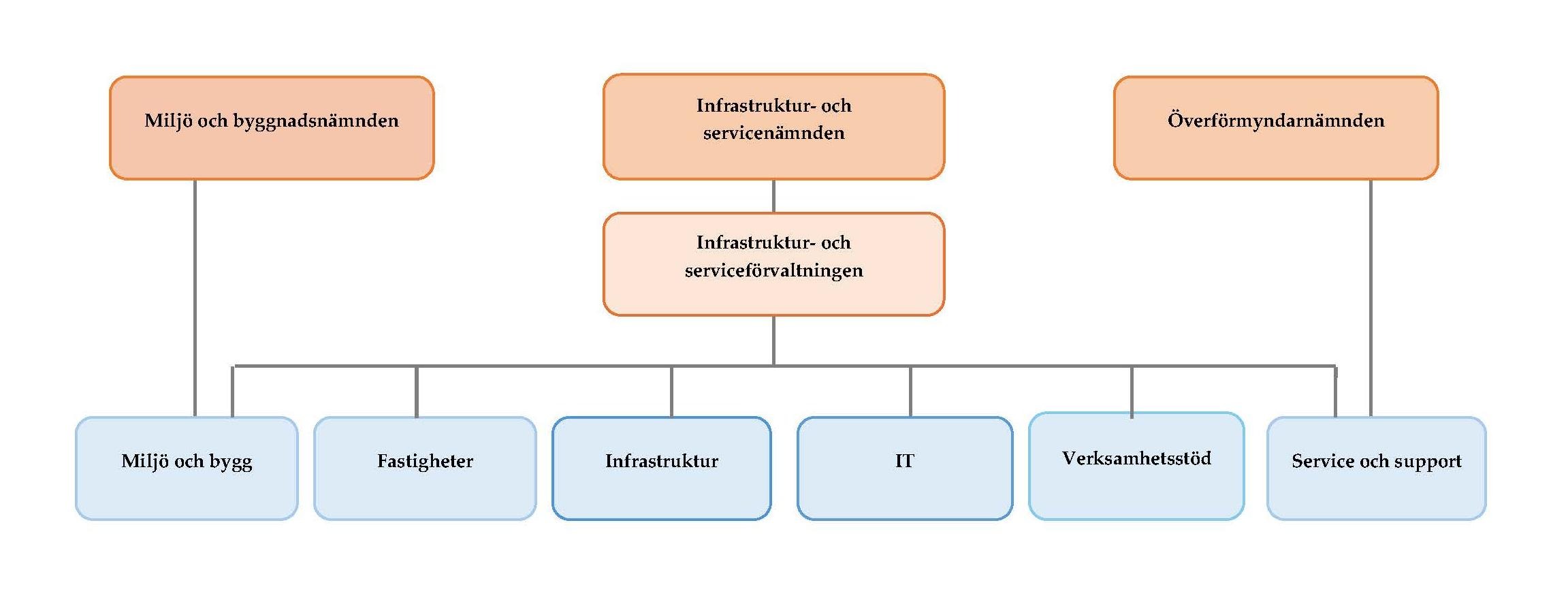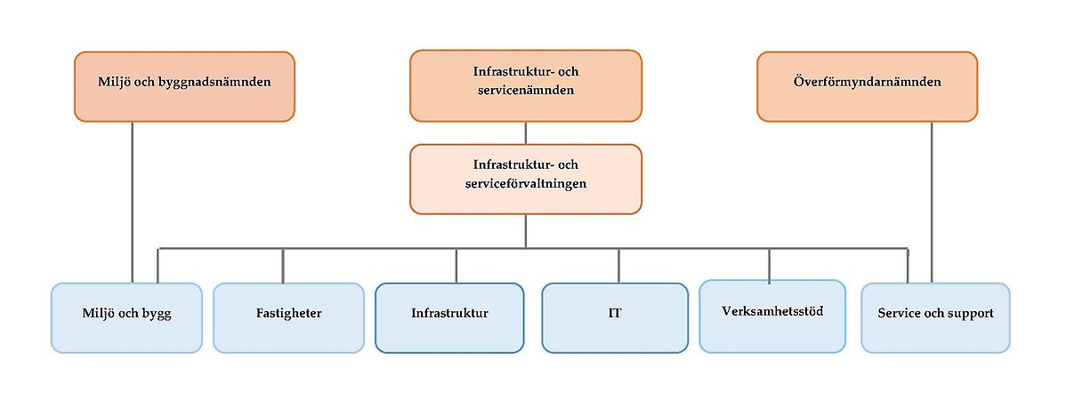 Infrastruktur- och serviceförvaltningen består av fem avdelningar; Miljö och bygg, Fastigheter, Infrastruktur, Service och support samt Verksamhetsstöd.