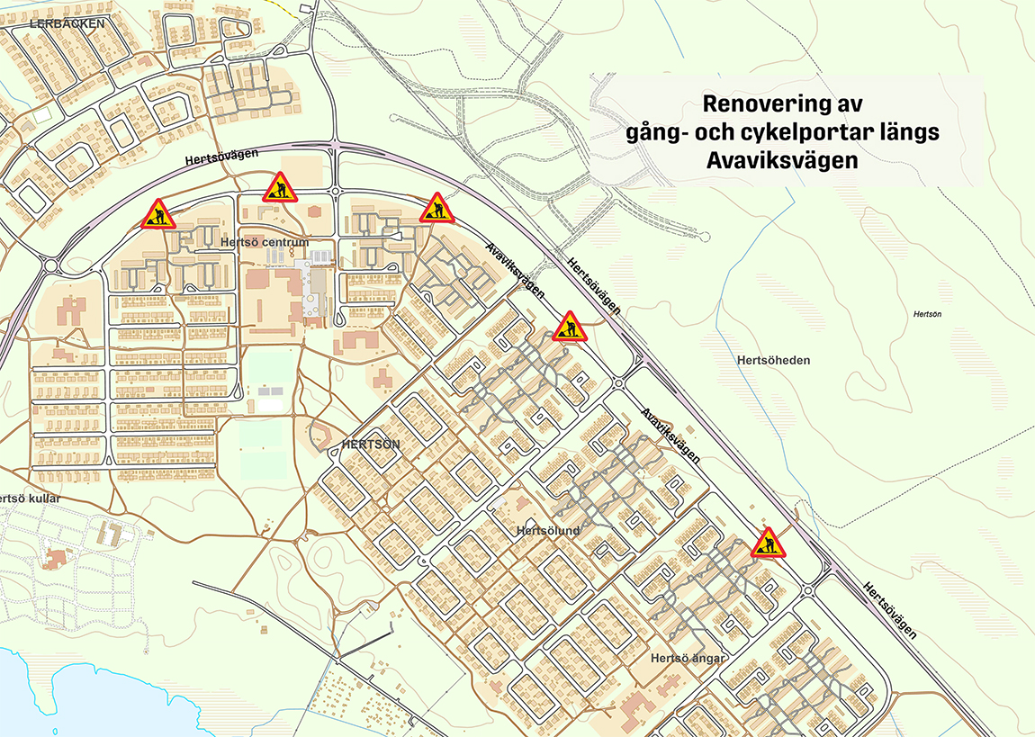 Vi renoverar fem befintliga cykelviadukter längs Avaviksvägen på Hertsön. Arbetsområdet stängs för genomfart, omledning av trafik sker.